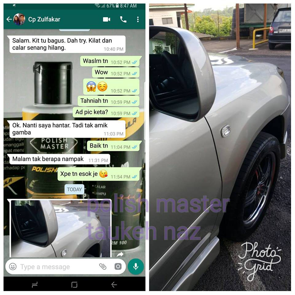 14,875 likes · 2 talking about this. Ni kalau calar tu teruk sangat. Ada beberapa jenis bentuk polish. Maknanya masih boleh di selamatkan lg le kelawaan kete aku. Untuk memotong (cut) sebahagian dari clear coat untuk menghilangkan kesan calar, swirl mark, spider web dan lain2 wax: Menghilangkan kesan minyak, gris, lecah tanah, lumpur, calar. Cstmer beli t1 polish & t3 wax bukan sahaja kereta dia kilatkan, kereta kwan2 dia pon dia buat happy 😂 😂.masalah lampu kusam?calar balar?semua selesai tak sampai dlm 2 minit 💥 terbukti berkesan 😍 👍 👍. _____ 2) jika calar dengan kesan geseran Pas transfer anak2 dlm umah, aku pun ambik towel khas dan produk polish tu, dan apa lg. Cermin kereta yang calar bukan teruk boleh digosok. Kalau yg dah lama tak polish dan wax tu, mmg mula2 kena pakai rubbing compound ler., utk tanggalkan kesan2 tar, serangga, taik burung dan sebagainya. Jika teruk benar, kena ketuk body n cat baharu. ☆lampu hadapan kusam dan kekuningan?