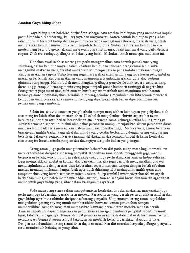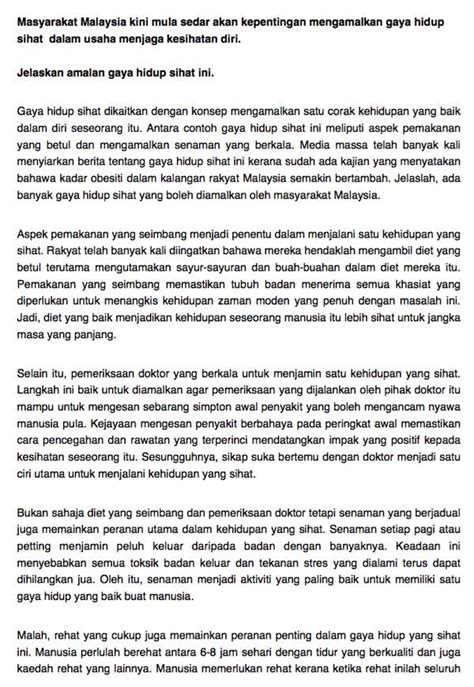 Karangan spm gaya hidup sihat setiap ahli keluarga memainkan peranan penting ke arah melahirkan gaya hidup sihat. Amalan gaya hidup sihat adalah cara hidup yang boleh mengurangkan pelbagai risiko penyakit pada masa hadapan. Amalan gaya hidup sihat ialah aktiviti yang selalu dibuat untuk mengekalkan kesihatan tubuh badan. Gaya hidup sihat boleh ditakrifkan sebagai satu amalan kehidupan yang membawa impak positif kepada diri seseorang, keluarganya dan masyarakat. Walaupun begitu, matlamat tersebut tidak mudah dicapai sekiranya seseorang itu tidak mengamalkan gaya hidup sihat.
